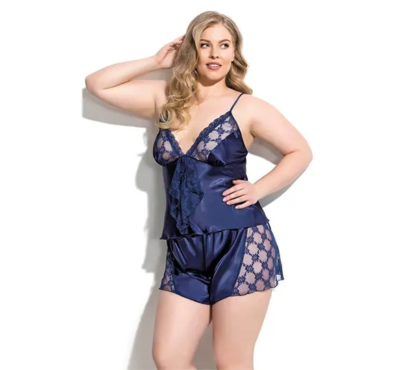Primoda Büyük Beden Saten Lacivert Babydoll Şortlu Takım 1052