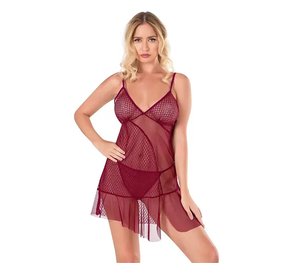 Primoda Desenli Transparan Bordo Tül Gecelik 4119
